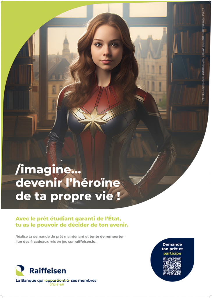 Ainsi, la Banque revendique clairement le recours à l’IA pour cette campagne, d’autant plus qu’elle s’adresse à une cible toujours plus sensible aux nouvelles technologies. La campagne « /imagine… » promeut le prêt étudiant garanti par l’État et invite ainsi les jeunes diplômés à prendre en main leur avenir et à s’approprier leur potentiel, telles de véritables superhéros.