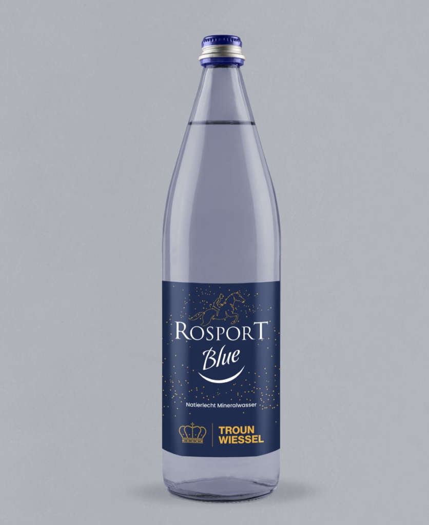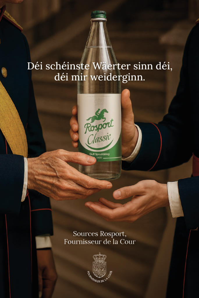 - Du côté de chez Sources Rosport: une édition de 50.000 bouteilles de Rosport Blue habillées d’une étiquette aux couleurs du Trounwiessel. Et une annonce top topical dans la presse et sur les réseaux sociaux, jouant sur la symbolique de la transmission des valeurs: