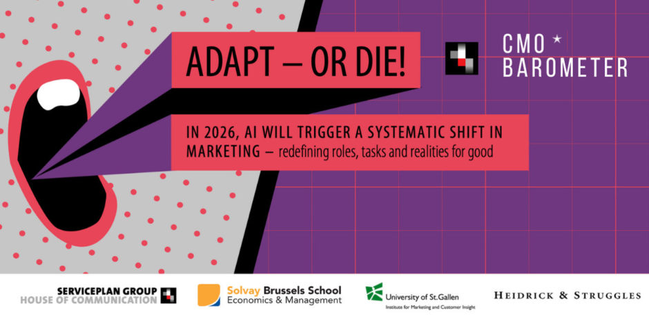 Réalisée depuis sept ans par Serviceplan Group, cette étude internationale s’est appuyée cette année sur les réponses 805 CMO issus de 15 marchés (dont 42 pour la Belgique et au Luxembourg). Elle analyse leurs priorités stratégiques, leurs attentes et les compétences clés qui façonneront l’avenir de la fonction marketing. L’étude a été menée en collaboration avec l’université de Saint-Gall (HSG) et, pour la première fois, avec le cabinet de recrutement et de conseil en leadership Heidrick & Struggles ainsi que la Solvay Brussels School of Economics & Management.