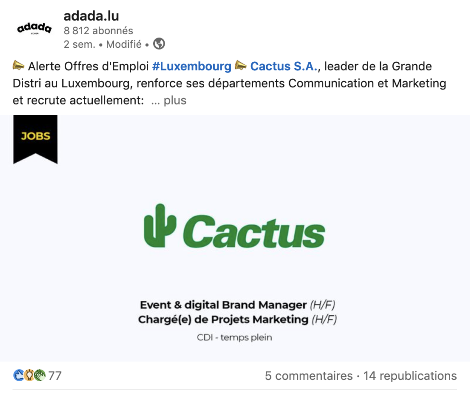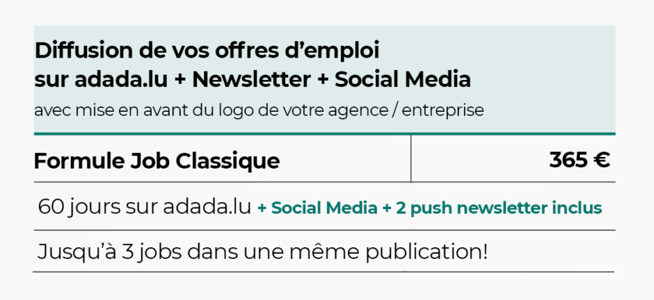 - Diffusion de votre offre d’emploi pendant 60 jours sur le site adada.lu