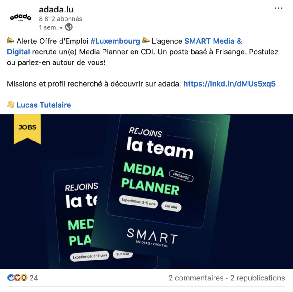 C’est un fait, adada.lu est devenu le jobboard de référence pour les métiers de la communication, de la publicité, du design, du marketing et du digital au Luxembourg. Vous recrutez actuellement ce type de profil? Profitez de nos solutions pour diffuser votre annonce auprès de la communauté adada: